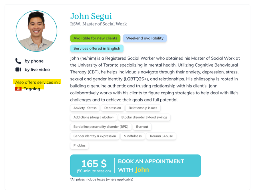 If we already offer services in the client’s language, we promote that option (without a translator) – ex, Spanish. You can see this information on the therapist’s profile (See image)
